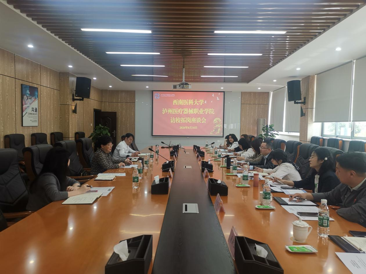 为深入推进毕业生就业工作,精准对接用人单位需求,搭建校校合作与人才输送桥梁,2026 年 4 月 16 日上午,西南医科大学党委研究生工作部部长·研究生院院长罗茂率队,携陈刘流副部长及各二级研究生培养单位分管就业工作领导一同赴泸州医疗器械职业学院开展访校拓岗交流活动。座谈会在泸州医疗器械职业学院行政楼二楼 210 会议室举行,会议由泸州医疗器械职业学院院长鞠梅主持,西南医科大学与泸州医疗器械职业学院相关单位负责人及工作人员共同参会。
